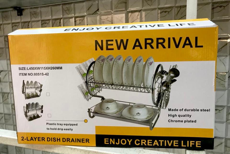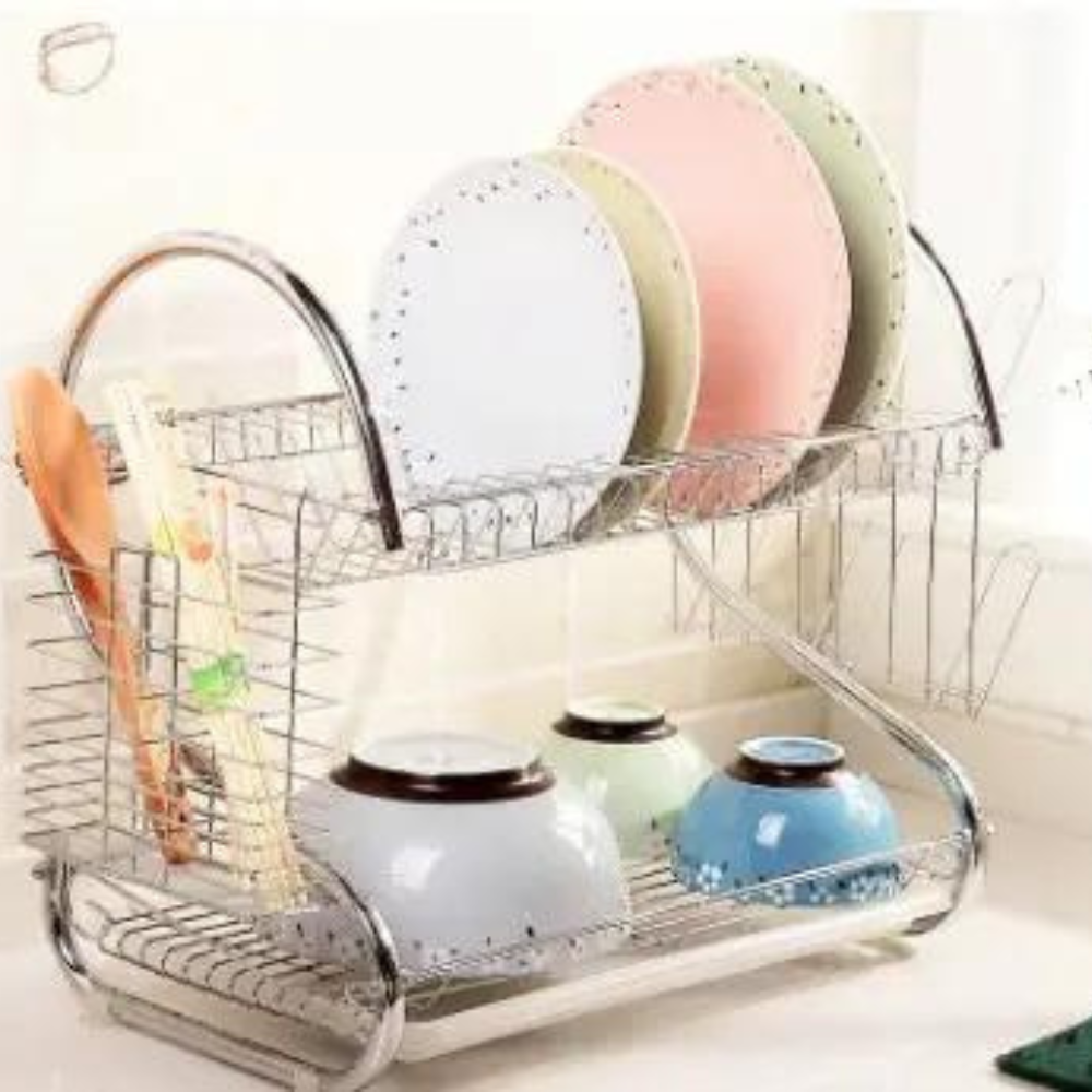 The top layer for plates and the bottom layer for cups and bowls.