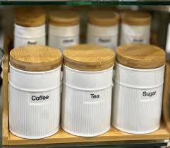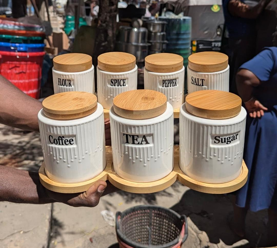 - 7 Piece Canister Set- Includes wood lids and stand- Keeps ingredients organized and easily accessible in the kitchen- Can store coffee, tea, sugar, and other favorites