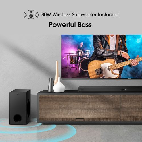 Easy to place and connect to your television, the Hisense H218 soundbar significantly improves your TV entertainment experience and is perfect for TV’s 32” or larger. Instead of just hearing the scene, you’re transported into it. A dedicated, wireless subwoofer delivers the robust low-end frequencies that punctuate your favorite movies, music, and games, without any messy wires. You’ll feel the “boom” while the two front-facing speakers project bright, clear high-and mid-range frequencies.
