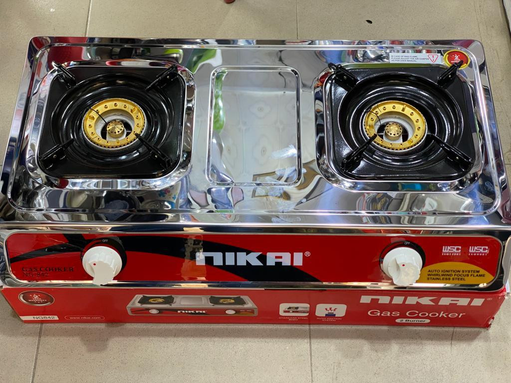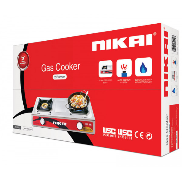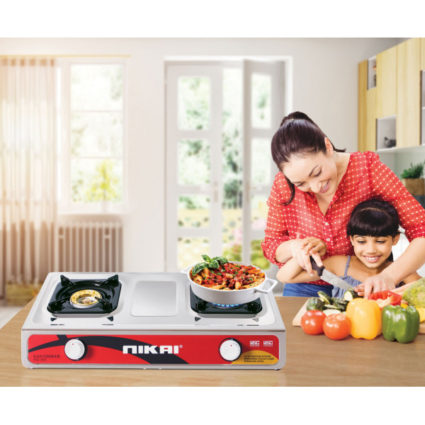 Straight flame brass burner cap Auto piezoelectric ignition Full safety device equipped Square enamel pan support Blue flame with high efficiency.