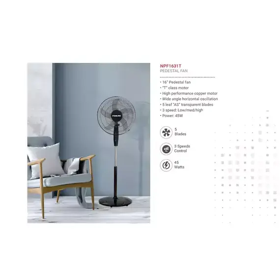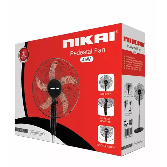 Nikai NPF1631T Stand Fan – 16" Pedestal Fan, 5 Blades, 45W, 3 Speeds, Copper Motor, Wide Oscillation
