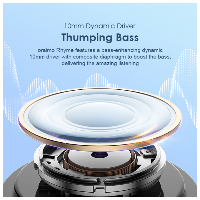 oraimo Rhyme features a bass-enhancing dynamic 10mm driver with composite diaphragm to boost the bass, delivering the amazing listening experience.