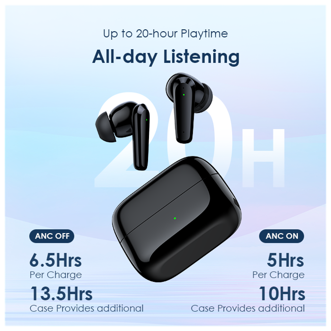Up to 6.5 hrs on single charge; case provides additional 13.5 hrs( ANC OFF)