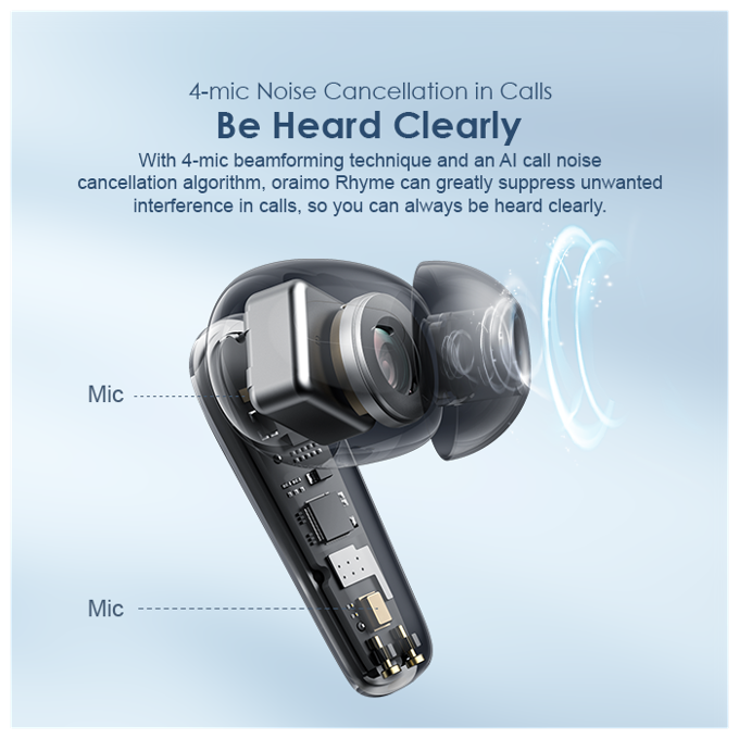 With 4-mic beamforming technique and an AI call noise cancellation algorithm, oraimo Rhyme can greatly suppress unwanted interference in calls, so you can always be heard clearly.