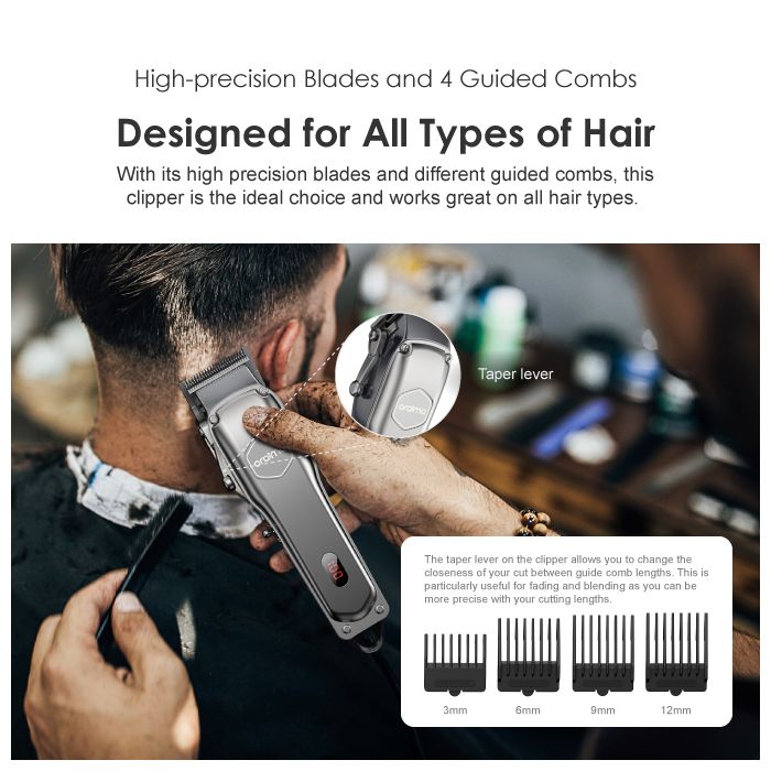 With its high precision blades and different guided combs, this clipper is the ideal choice and works great on all hair types.The taper lever on the clipper allows you to change the closeness of your cut between guide comb lengths. This is particularly useful for fading and blending as you can be more precise with your cutting lengths.