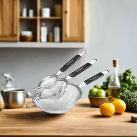 Built from premium stainless steel mesh, these strainers resist rust and corrosion while delivering ultra-fine filtration for smooth textures. The insulated, non-slip handles keep your hands safe from hot liquids, and convenient hanging loops make storage effortless. Lightweight and durable, this trio is a go-to for any cooking task.