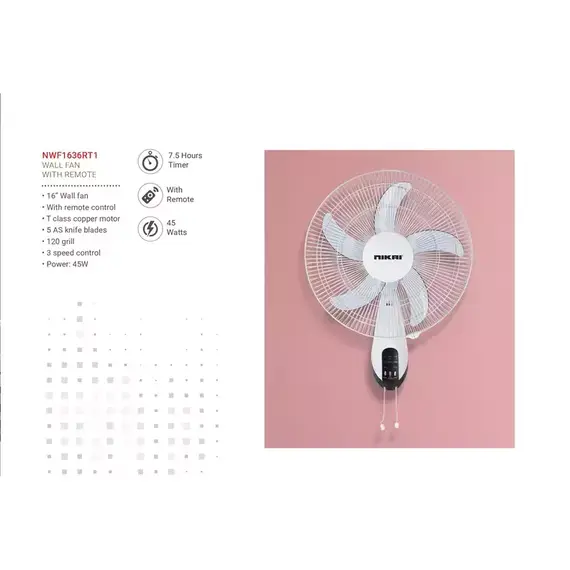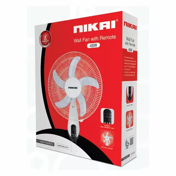 Nikai wall mount fan for use in clean and dry commercial applications such as schools, shops, offices or warehouse. This Nikai wall mount fan in white color features T class copper motor, 5 AS knife blades and 120 grill for added versatility. Fan has 3 energy efficient speeds and is useful for indoor cooling power. With reinforced wire grill for added safety and metal construction you can be sure it is durable.