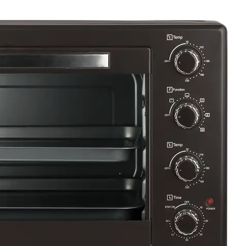 * Separate temperature selector - separate and precise temperature control for upper and lower racks, allows you to set two temperatures for different foods at a time, provides maximum cooking flexibility. * Simply control & 60-minute timer - set the temperature and timer to your exact specifications using the easy-to-turn knobs. The auto shutoff and signal bell give you peace of mind that your food won't overcook once the time is up. * Fast & even heating - Luby electric oven can be heated fast and even by the four heating Tubes. Perfect for broiling turkey, fish, baking pizzas, cookies, toasting bread and keeping food warm, just about everything!